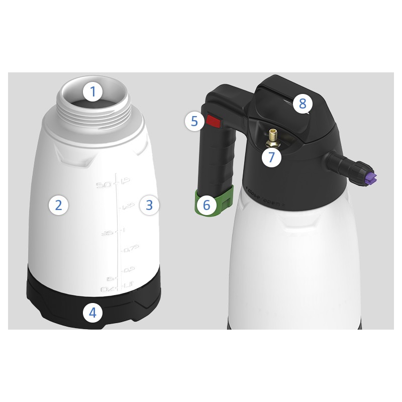 In a particularly advantageous way the Foam Pro 2 + sprayer has a compressed air connector;an inlet valve located in the sprayer head that allows the insertion of air into the tank thanks to its universal schrader valve for connectors worldwide.