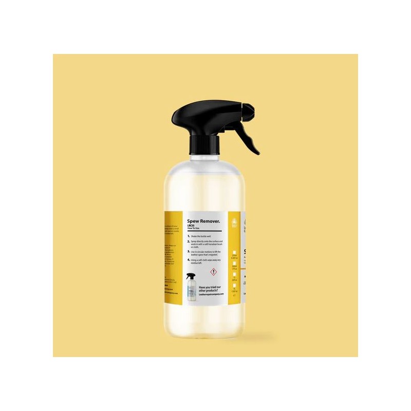 Ensure the leather is dry before you begin and free of dirt and grime. Spray the spew remover directly onto the leather and work in with a soft horsehair brush or bamboo fibre pad, wipe away the fluid with a soft bamboo fibre towel to leave the surface free of spew. A second application may be required, then protect with a protection cream or protection spray.
